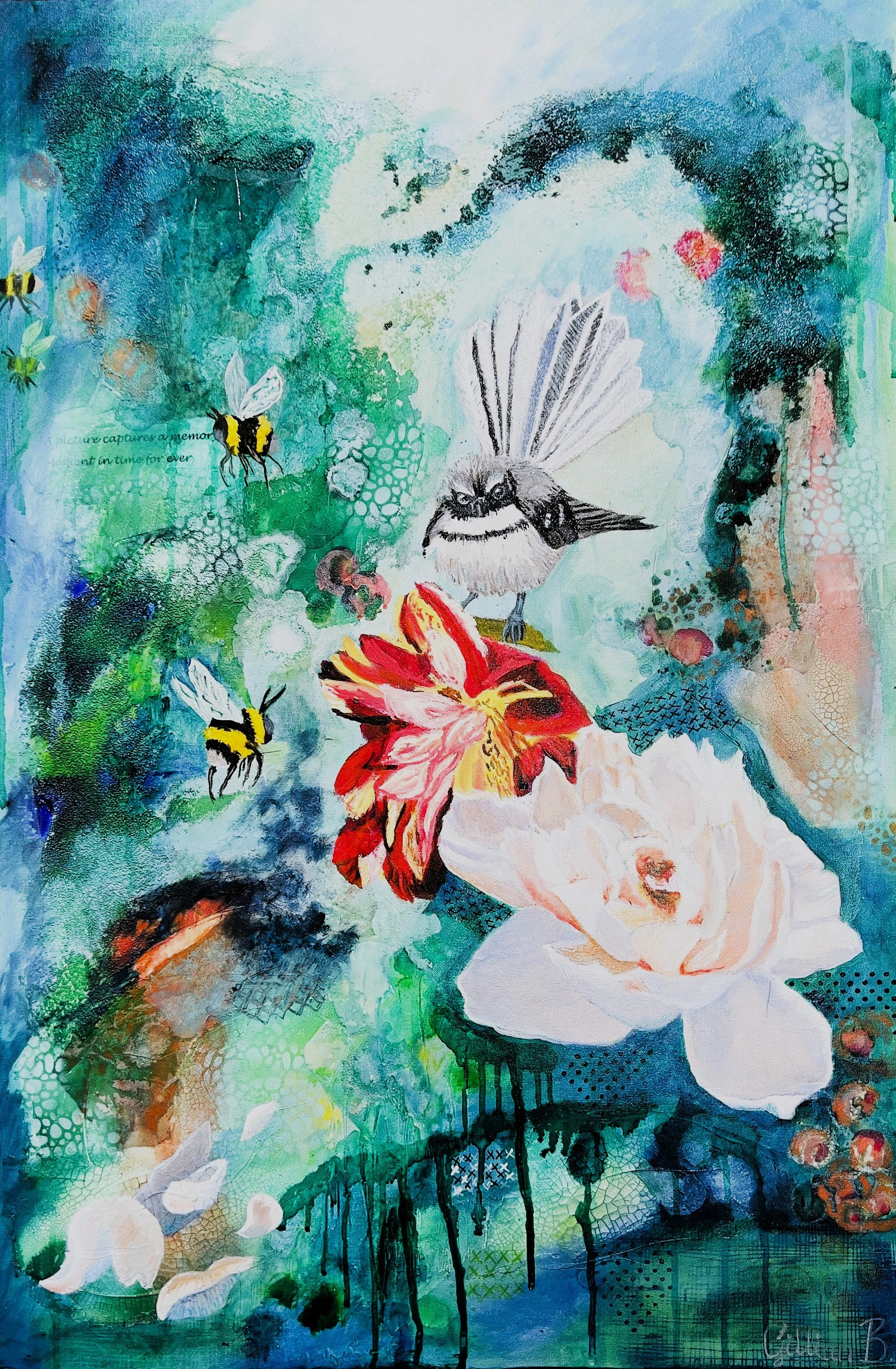 The Garden Breathes in Magic is a celebration of the small, sacred rhythms that animate the natural world –a moment of stillness alive with flight, fragrance, and transformation. The fantail serves as messenger between us and the spirit world. This work invites you into a space where every wingbeat and falling petal is part of a quiet spell woven through light, breath, and bloom which resonates with the soul in our favourite places.