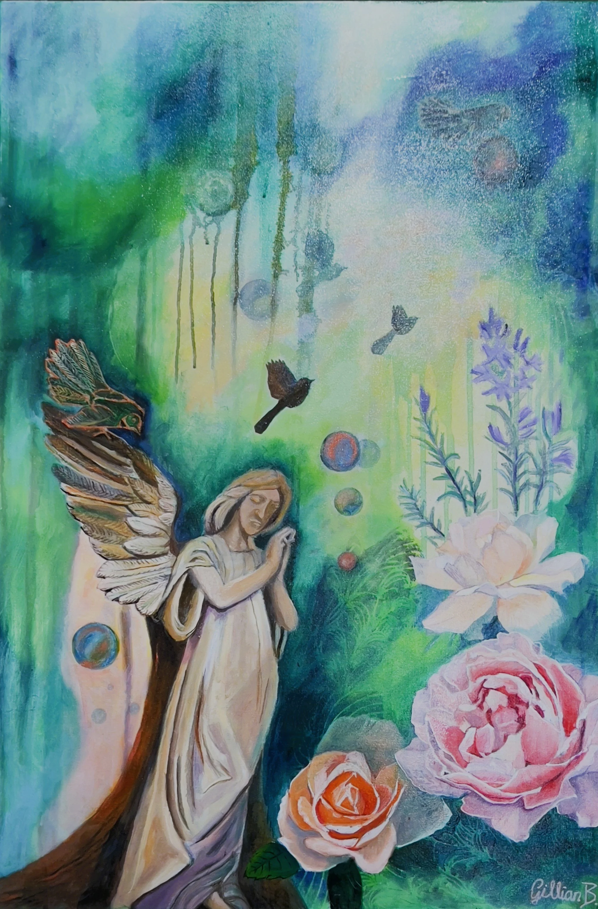 Where Fantails Dance and Angels Dream is a reflection on those we love who are no longer with us in person. We remember. them, their presence is in the guardian angel sent to us in times of our greatest need and can be felt in those quiet places of nature where the sacred and the natural, the ephemeral and the eternal meet. The painting invites you to pause in the stillness and connect with your own memories.